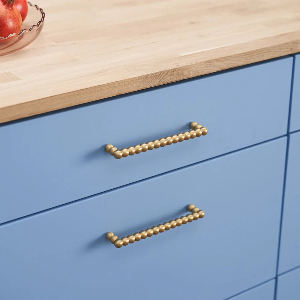 Hardware can be chosen to complement other design elements in your kitchen or bathroom space, such as the tiles and paint colours, or it can be used to create distinction and contrast. In a minimalist design scheme, in which tiles are black and white and paint neutral, you might consider choosing black aluminium hardware for a seamless look. In a more flamboyant, Cottagecore kitchen — in which eclecticism is key, your hardware choice might be more standout, like BOBBIN Pulls in brass. Imperfect zellige tiles in punchy colours, plus butter-yellow paint, would only add to the busy look.
